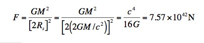 In old units, this is 7.57 x 10^47 dynes. (Haramein has made some elementary rounding errors that have given him 7.49 instead of 7.57, but we can let this pass.)To put this number in perspective, this force is: